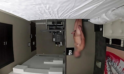 dickflash in a hotel where a maid comes through the balcony and gets cum on her tits