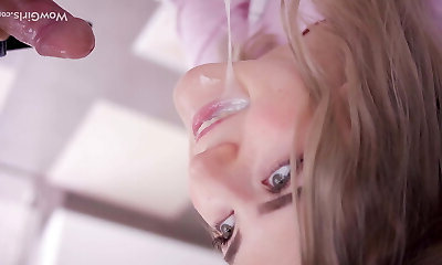 Hottie ginger-haired in public gets cum on her face after a good fuck her tight pussy
