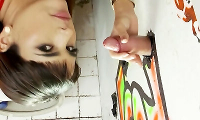 Short haired beauty guzzles cum from strangers in public