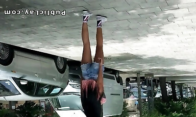 Gorgeous bootie fat masturbating MILF in leather skirt outdoors