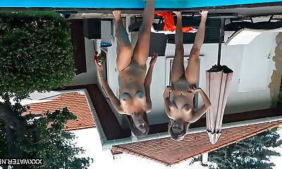 2 foxy brunette amateurs cannot stop finger tearing up each other being in pool