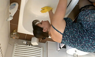 The camera watches the big ass under the brief robe of my mature stepmother. Chubby milf in everyday life. Sexy plus-size? Pawg.